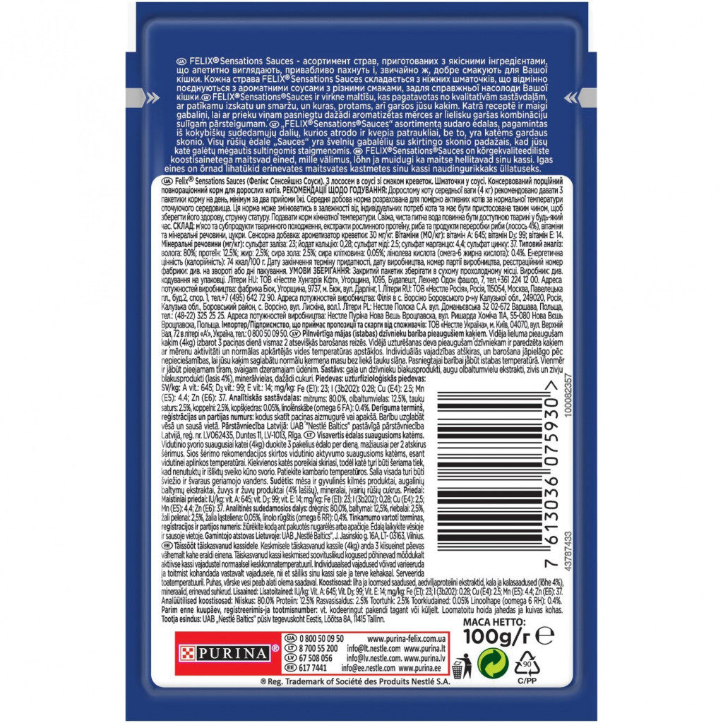 Вологий корм для кішок Purina Felix Sensations Sauces в соусі з лососем та креветками 100 г (7613036075930)