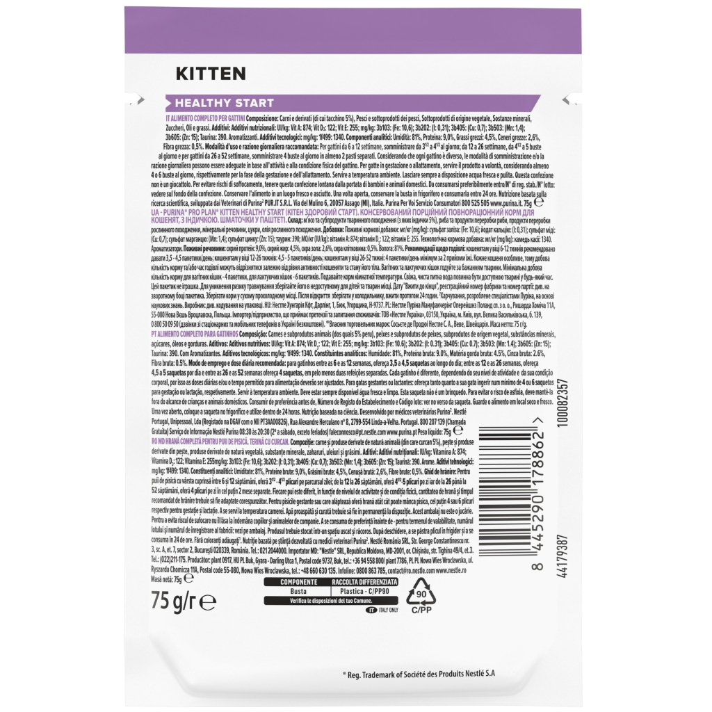 Консервований порційний повнораціонний корм спеціально розроблений для кошенят та містить усі поживні речовини, необхідні кошеняті для здорового зростання. Корм підходить для всіх кошенят віком від 6 тижнів до 12 місяців. Також підходить для вагітних кішок та кішок у період лактації. Міжнародне товариство лікарів-фелінологів визнає сприятливий внесок кормів PURINA у благополуччя котів.
