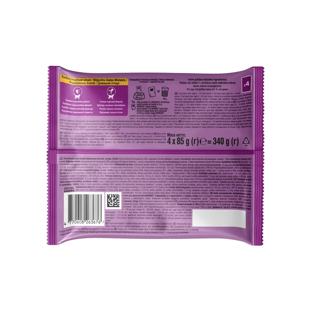 Основні інгредієнти включають 35% м'яса, з яких 4% - це делікатесна індичка. Завдяки додаванню мінералів та злаків, корм забезпечує повноцінне та збалансоване основне годування. Особлива текстура допомагає забезпечити легке жування та підвищує задоволення вашого кота. Оберіть Whiskas для якісного та здорового живлення вашого пухнастого друга!