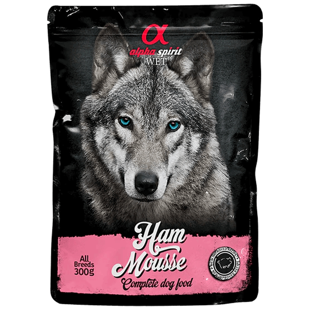 ALPHA SPIRIT Ham Mousse – повнораціонний вологий корм для собак старше 1 року. Корм стане чудовим доповненням до сухого раціону вашого собаки. Він поєднує в собі поживності, ніжну текстуру та смак, який сподобається навіть гурманам. Раціон Ham Mousse містить єдине джерело м'ясних протеїнів – 95% свинини. Ідеально для собак з чутливим травленням.