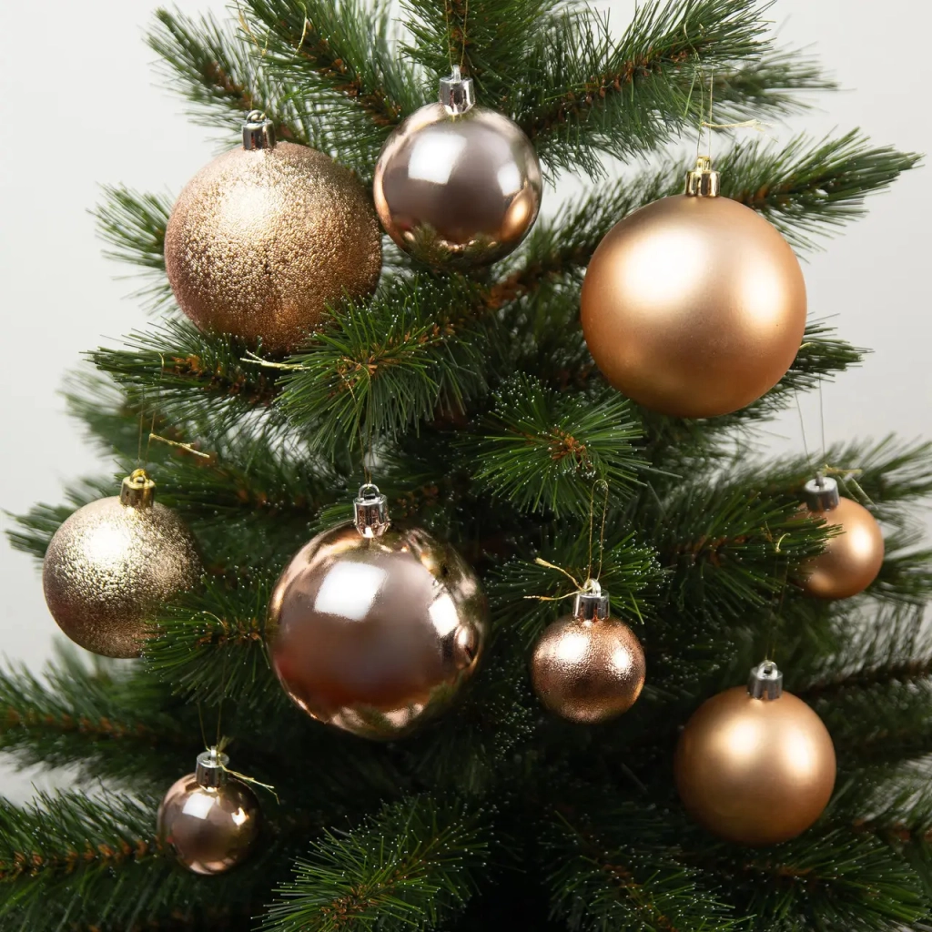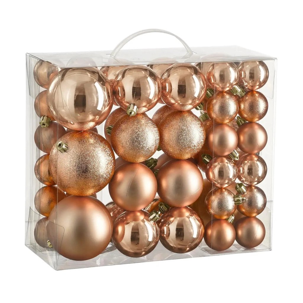 Особливістю набору є різноманіття розмірів (Ø 4/6/8 см) та покриттів (матові - 14 шт; глянцеві - 18 шт; рельєфні блискучі - 14 шт) пластикових кульок, представлених у ніжному персиковому відтінку*, що дозволяє чарівно оздобити новорічне дерево у повноцінну святкову композицію. Комплект особливо вдало виглядає на фоні зеленої хвої, а також впишеться у будь-який інтер'єр — залишається лише вдягнути кульки на вашу ялиночку!