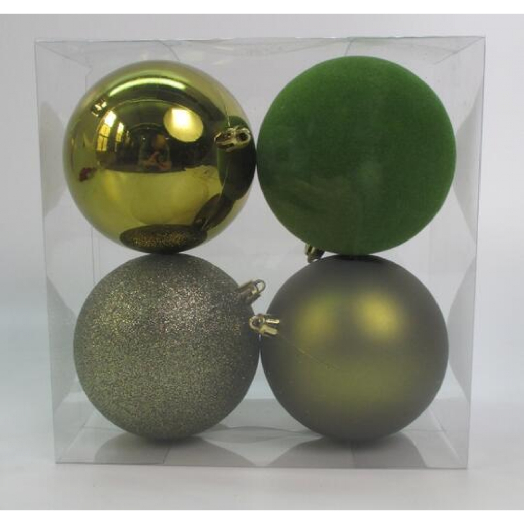Набір ялинкових кульок використовується для прикрашання новорічної ялинки, хвойних гілок і декоративних композицій. Матеріал: пластик. Кількість в упаковці: 4 шт. Діаметр: 10 см.