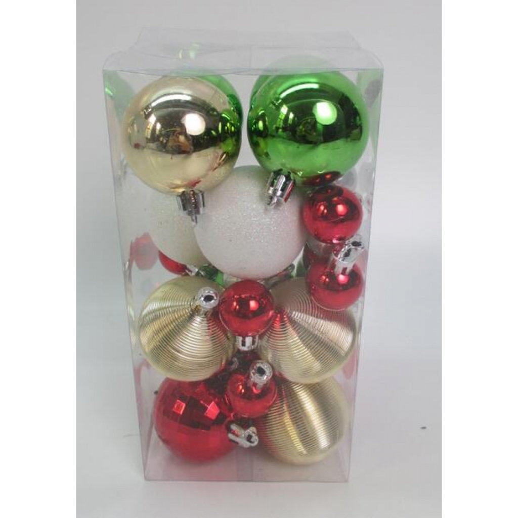 Набір ялинкових кульок використовується для прикрашання новорічної ялинки, хвойних гілок і декоративних композицій. Матеріал: пластик. Кількість в упаковці: 30 шт.