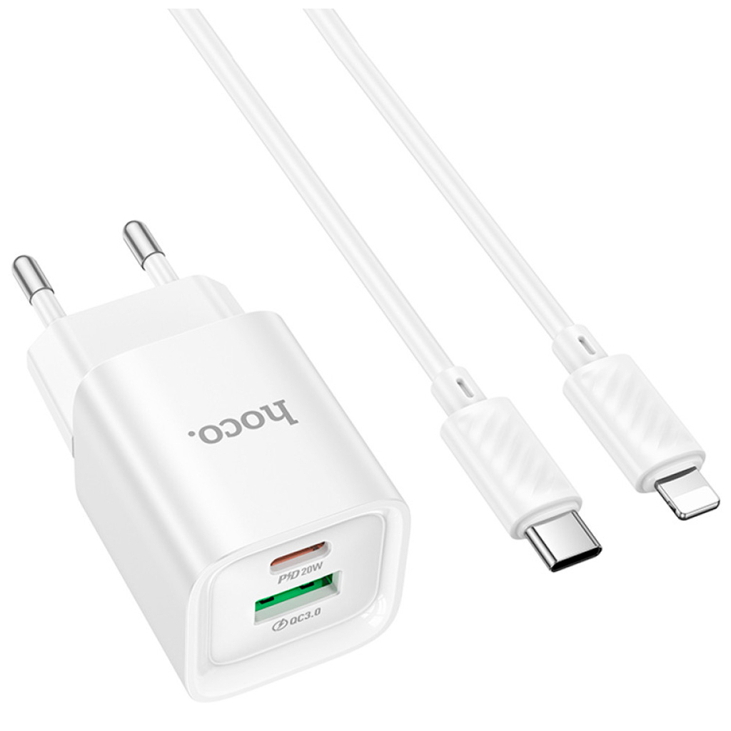 Зарядний пристрій HOCO C147A Charm 1xUSB-C PD20W + 1xUSB QC3.0 + cable USB-C to Lightning White (6942007630283)