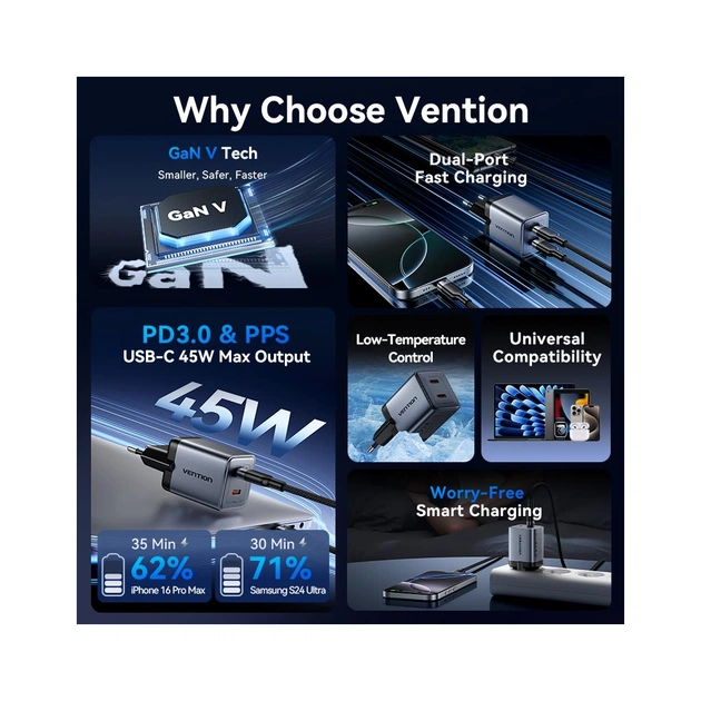 Зарядний пристрій VENTION 2xUSB-C PD45W GaN з кабелем USB-C to USB-C довжиною 1.0 м (TZ-FCDH0-EU) — ваш надійний партнер у світі електроніки. Завдяки технології галиевого нітриду (GaN), цей пристрій характеризується підвищеною ефективністю, що дозволяє створювати більш компактні зарядні блоки з потужністю до 45 Вт на кожному з двох незалежних портів USB-C.