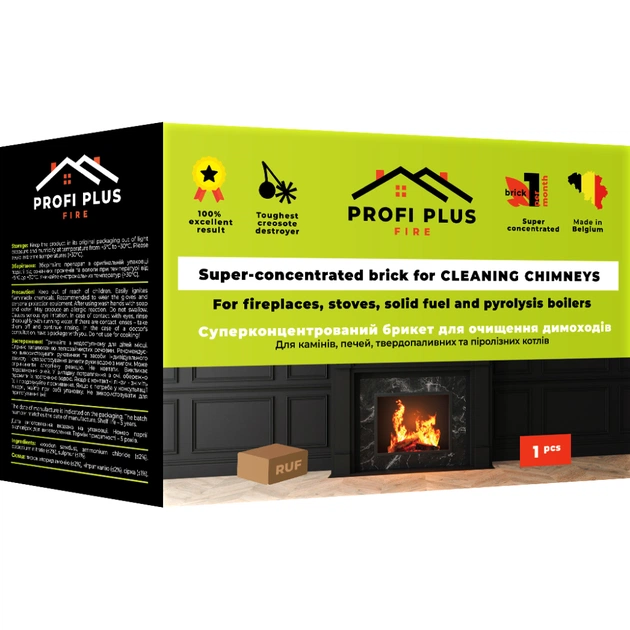 Суперконцентрований брикет для очищення димоходів — спресований брикет із деревної тирси та суміші хімічних реагентів для видалення складних забруднень креозотом і сажею в димоходах, трубах й інших важкодоступних місцях опалювальної системи.