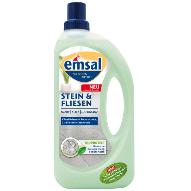 Нова рецептура засобу для каменю і кахлю із захистом від плям Emsal зі спеціальними просочувальними засобами захищає поверхню чутливих кам'яних підлог від плям жиру і бруду і, таким чином, полегшує поточну очищення - зовсім без нашарувань. Для підлог, що піддаються особливому навантаженню (подряпини, колії) рекомендується застосовувати в чистому вигляді, щоб дати підлозі необхідний інтенсивний догляд і повернути природний блиск.