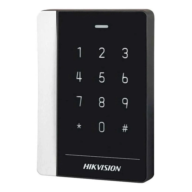 DS-K1102AEK – складова системи контролю у вигляді зчитувача EM-карт із додатковою клавіатурою. Інтегрується до охоронної мережі для контрольованого доступу до закритих приміщень. Кардрідер має спеціальний інтерфейс, призначений для ідентифікації карток. Крім цього, можна встановлювати PIN-коди за допомогою сенсорної панелі із клавішами. DS-K1102AEK володіє надійним захистом проти злому та точною авторизацією. З роботою справляється 32-бітовий процесор. Термінал вимагає трохи більше 2Вт потужності для повноцінного функціонування. Розміщення накладного захисного обладнання багаторазово посилює безпеку. Особливо актуально для офісів із документацією, фінансами та іншим важливим вмістом.