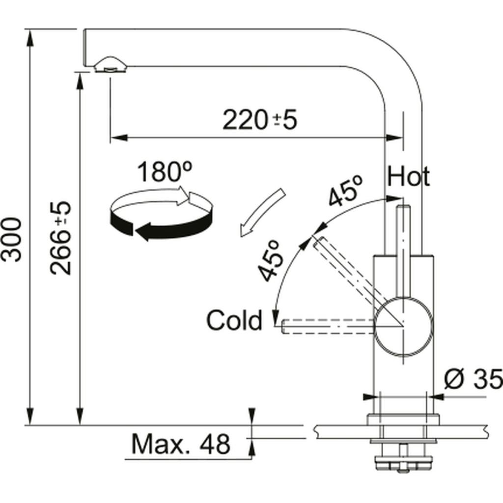 Кухонний змішувач з поворотним виливом і бічним важелем керування. Інноваційний аератор формує кришталево-чистий, прозорий ламінарний потік води без розбризкування. Кут повороту виливу складає, 180° тому водяний потік досягає більшої площі мийки.