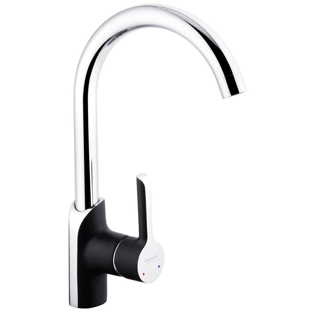 Одноважільний, врізний змішувач кухонний (KRP) Essen-SCH030 від Kroner виготовлений з латуні з покриттям чорного і хромованого кольору, має поворотний вилив довжиною 17.5 см, і встановлюється на один отвір за допомогою гнучкого шлангового під'єднання під діаметр 1/2".
