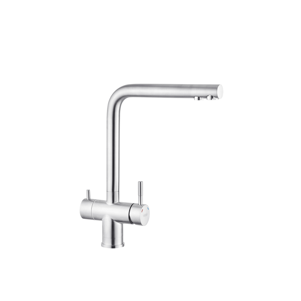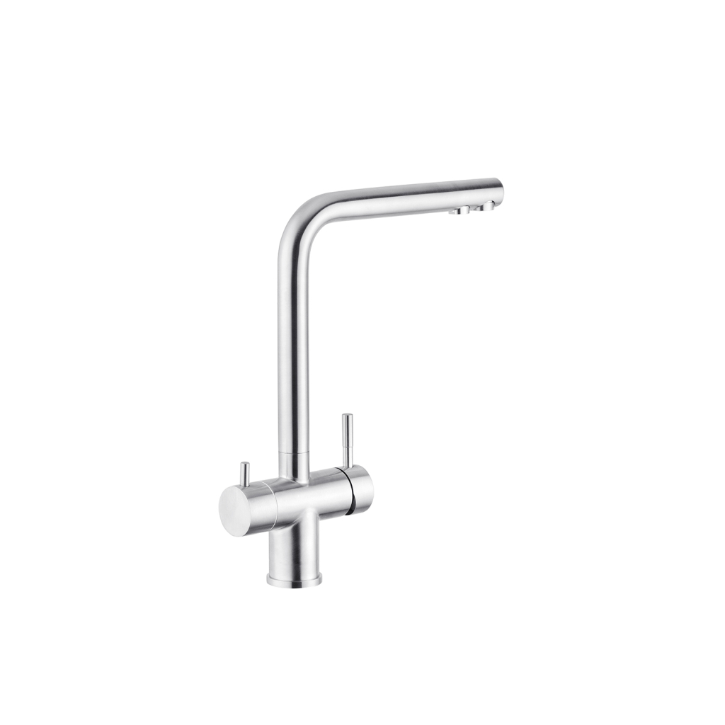 Змішувач для кухні з підключенням до фільтру Kroner (KRP) Edelstahl Klassisch-ESG03811 виготовлений з високоякісної нержавіючої сталі, яка не піддається корозії, стійка до ударів та появи тріщин. Змішувач має Г-подібну форму з трьома контурами підключення води. За участю першого та другого здійснюється підключення холодної та гарячої води, де змішування відбувається за допомогою картриджа.