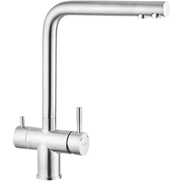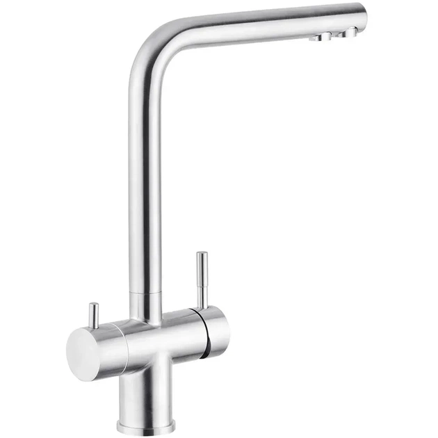 Змішувач для кухні з підключенням до фільтру Kroner KRP Edelstahl Klassisch - ESG03811 виготовлений з високоякісної нержавіючої сталі, яка не піддається корозії, стійка до ударів та появи тріщин. Змішувач має Г-подібну форму з трьома контурами підключення води. За участю першого та другого здійснюється підключення холодної та гарячої води, де змішування відбувається за допомогою картриджа.