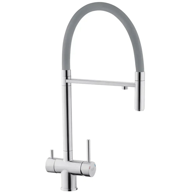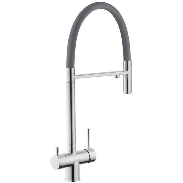 Змішувач для кухні з підключенням до фільтру Kroner KRP Edelstahl Klassisch - ESG03815GRA виготовлений з високоякісної нержавіючої сталі, яка не піддається корозії, стійка до ударів та появи тріщин. Змішувач має U-подібну форму з трьома контурами підключення води. За участю першого та другого здійснюється підключення холодної та гарячої води, де змішування відбувається за допомогою картриджа.