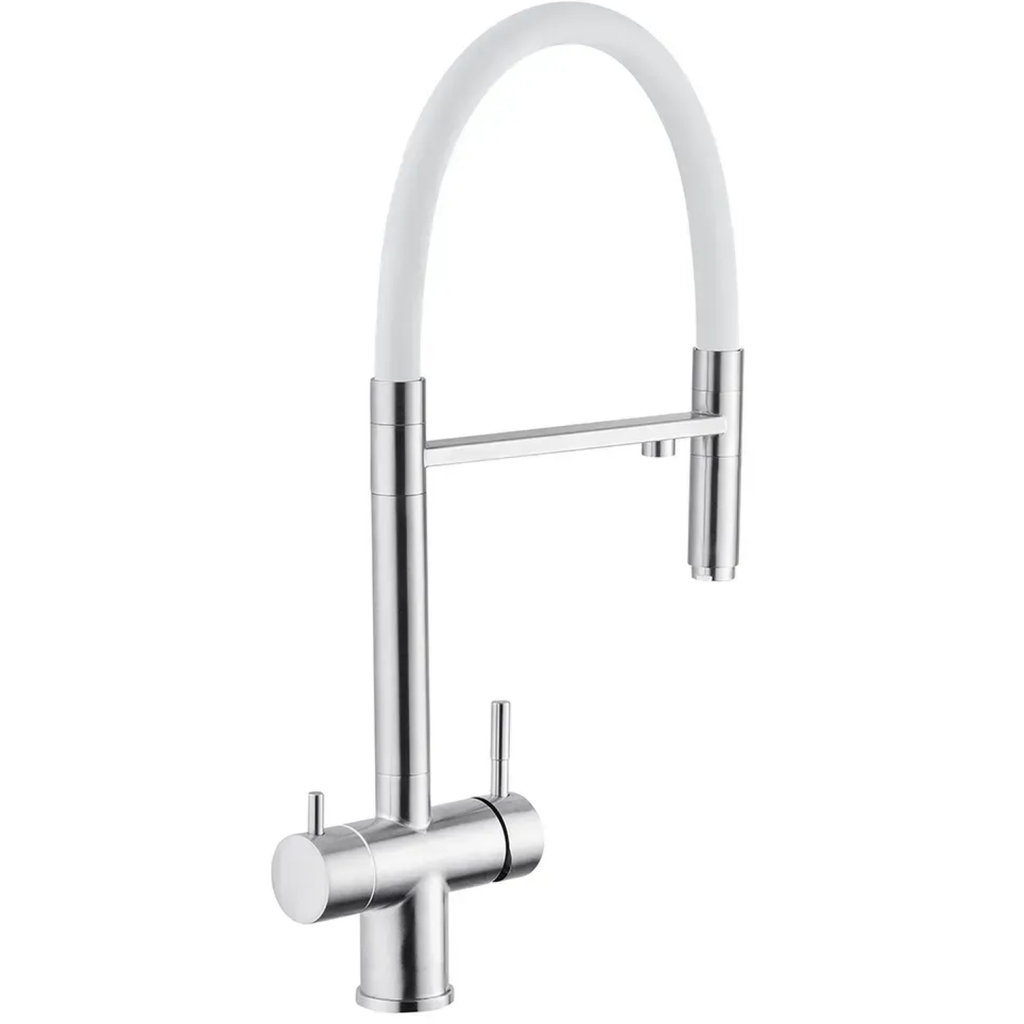 Змішувач для кухні з підключенням до фільтра Kroner (KRP) Edelstahl Klassisch-ESG03815WHI виготовлений з високоякісної нержавіючої сталі, яка не піддається корозії, стійка до ударів та появи тріщин. Змішувач має U-подібну форму з трьома контурами підключення води. За участю першого та другого здійснюється підключення холодної та гарячої води, де змішування відбувається за допомогою картриджа.