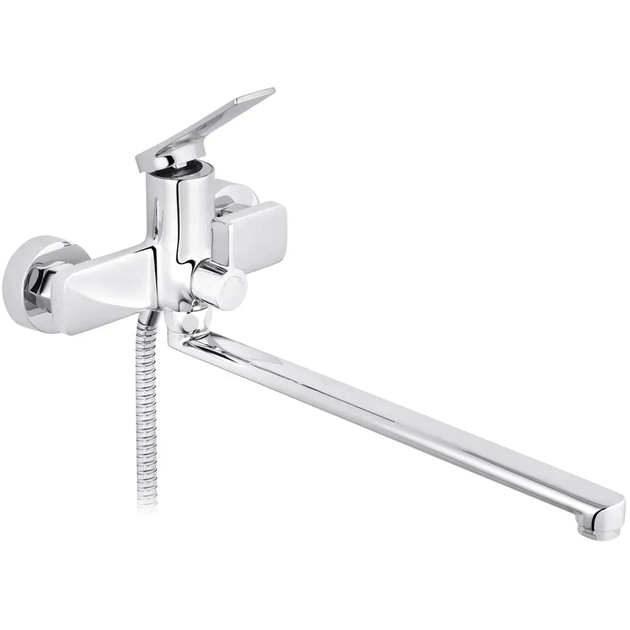 Змішувач виготовлений із міцної латуні, що гарантує довговічність і стійкість до корозії. Глянцева поверхня в хромованому кольорі надає виробу сучасного та витонченого вигляду, який ідеально доповнить будь-який інтер’єр. Настінний спосіб монтажу забезпечує надійність установки та зручність у користуванні.