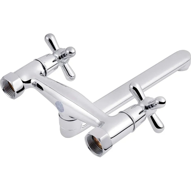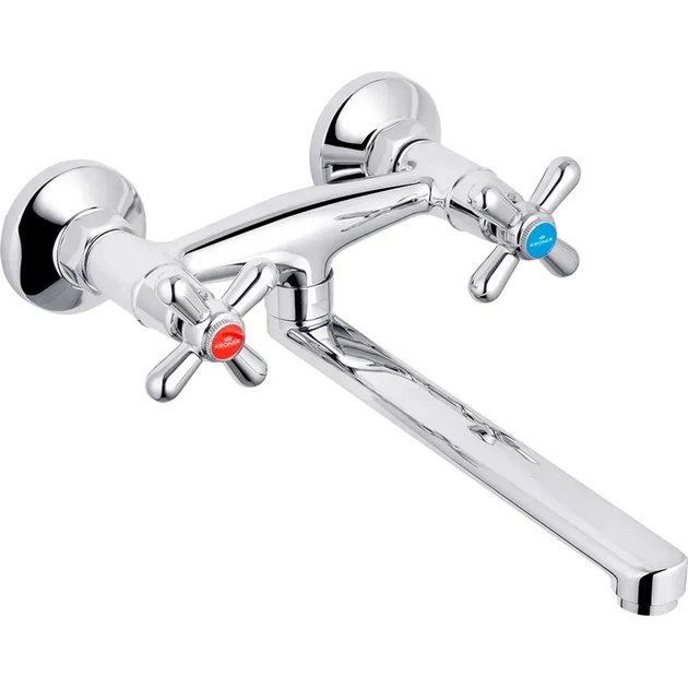 Змішувач для кухні Kroner KRP Royce - C040 настінна модель, що відрізняється сучасним дизайном та надійністю. Латунне пристрій з глянсовою хромованою поверхнею естетично та довговічно. Виконаний у класичному стилі, з вентильними ручками для перемикання потоку холодної та гарячої води. Монтаж здійснюється за допомогою ексцентриків, що забезпечують максимальне прилягання до труб та знижують рівень шуму.