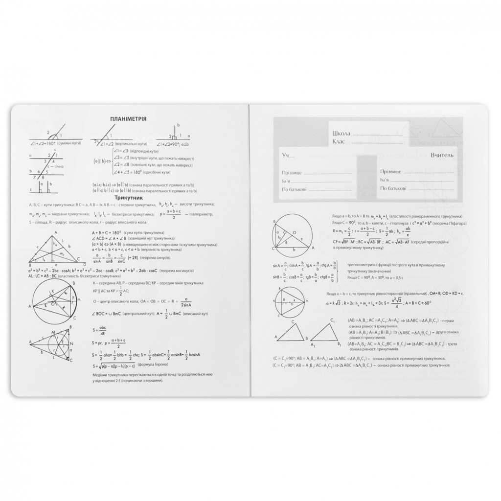 - У внутрішньому блоці на шести сторінках розміщено довідкову інформацію. Ця інформація включає основні формули, теореми та правила. Таким чином, предметний зошит з геометрії є корисним посібником для школярів, надаючи необхідну інформацію безпосередньо у навчальному процесі;