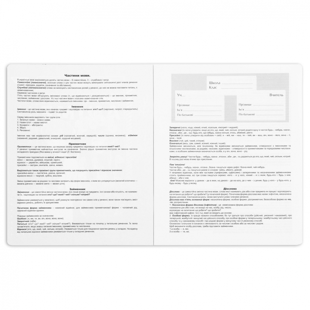 - У внутрішньому блоці на шести сторінках розміщено довідкову інформацію. Ця інформація включає основні правила української мови, такі як орфографія, пунктуація, граматичні норми та інші важливі відомості, які допомагають учням у вивченні предмета.Таким чином, предметний зошит з геометрії є корисним посібником для школярів, надаючи необхідну інформацію безпосередньо у навчальному процесі;