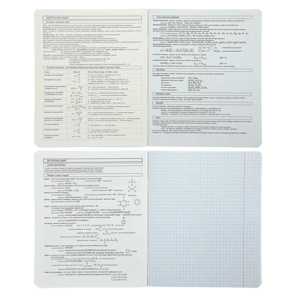 Набір містить 10 зошитів з 8 предметів: алгебра – 1 шт, геометрія – 1 шт, фізика – 1 шт, хімія – 1 шт, біологія – 1 шт, географія – 1 шт, історія України – 1 шт, англійська мова – 1 шт, зошит загальний (без довідкової інформації) - 2 шт.