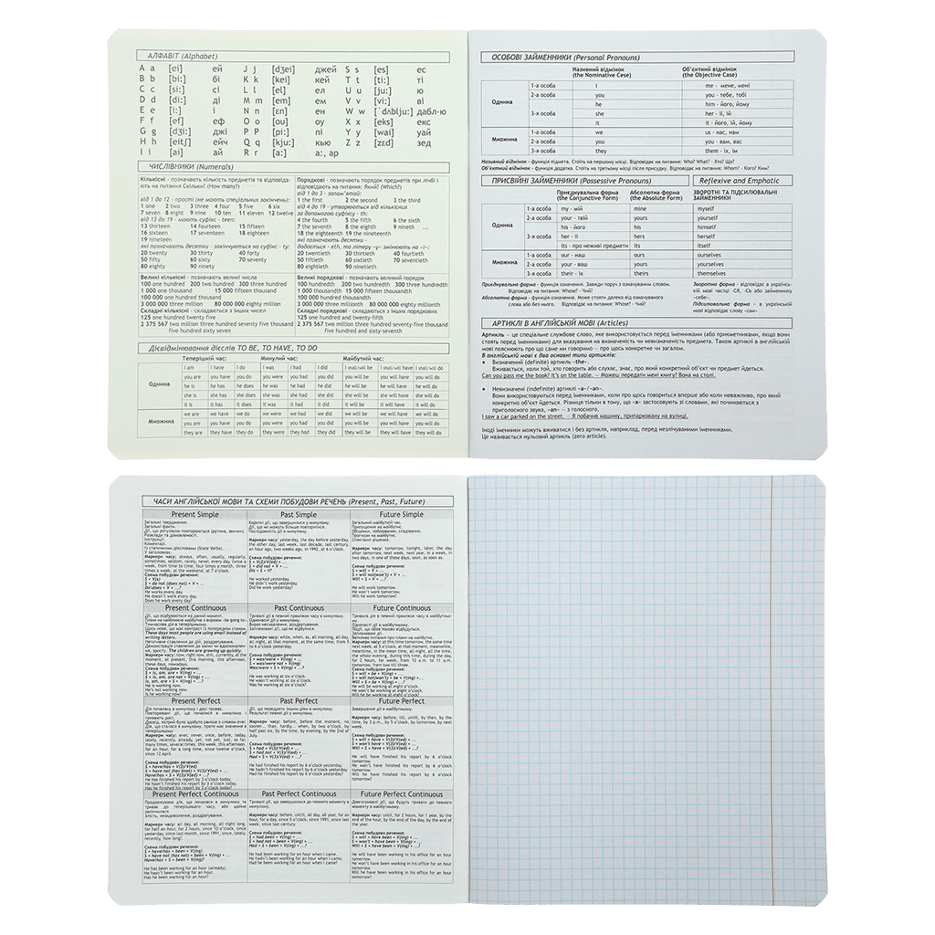 • на внутрішньому боці обкладинки, а також на першому та останньому додатковому аркуші, розміщено довідкову інформацію з предмета (загалом 6 сторінок визначень, понять і правил з предмета).