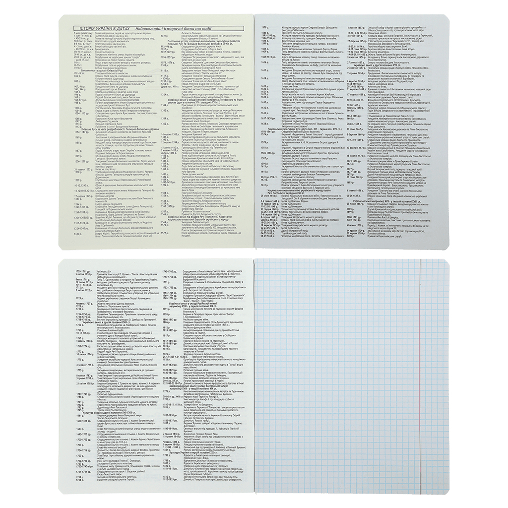 • на внутрішньому боці обкладинки, а також на першому та останньому додатковому аркуші, розміщено довідкову інформацію з предмета (загалом 6 сторінок подій і дат з історії України)